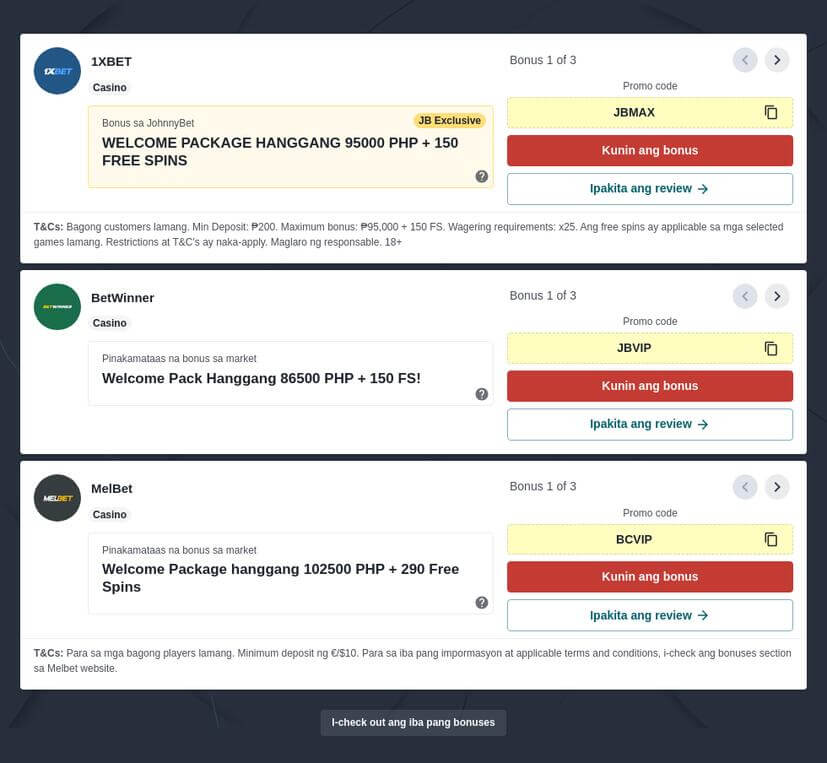 Alamin muna kung paano makakuha ng mga bonus sa online casinos at ano ang promotional code sa pag-register. Ang online casinos sa Pilipinas ay mayroong mga top bonus codes na pwede mong maggamit sa paglalaro. Para sa mga online gamblers, mahalagang pakinabangan ang mga bonus na ito upang i-maximize ang pwedeng mapanalunan. Alamin ang iba pang bonus code na inirerekomenda ng Johnnybet!