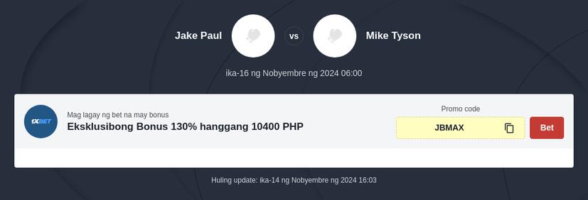 Marami na ang Jake Paul vs Mike Tyson betting odds na makikita sa mga paborito mong bookmakers na available dito sa Pilipinas. Ang inaabangan na laban ay magaganap sa Arlington, Texas sa paparating na ika-16 ng Nobyembre ngayong taon. Ang kasalukuyang odds ni Jake Paul sa 1XBET ay 1.45 habang si Mike Tyson ay mayroong 2.87 odds. Kung naghahanap ka ng konting gabay bago tumaya, mabuting alamin ang aming Jake Paul vs Mike Tyson boxing prediction upang manalo sa iyong taya.